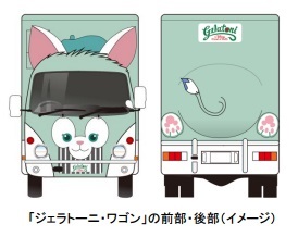 このたび登場する「ジェラトーニ・ワゴン」の車体は、ぬいぐるみと同じ生地でラッピングされており、前部は美しい瞳のジェラトーニの顔が、後部にはおしりや長いしっぽ、ミッキーシェイプの肉球がついた足をイメージしたデザインが施されています。また、車内には、ジェラトーニが描いた絵を載せており、ジェラトーニの魅力がふんだんに盛り込まれた車となっています。
